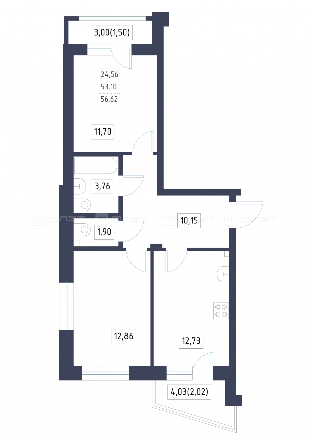 - 56.62/24.56/12.73 м²